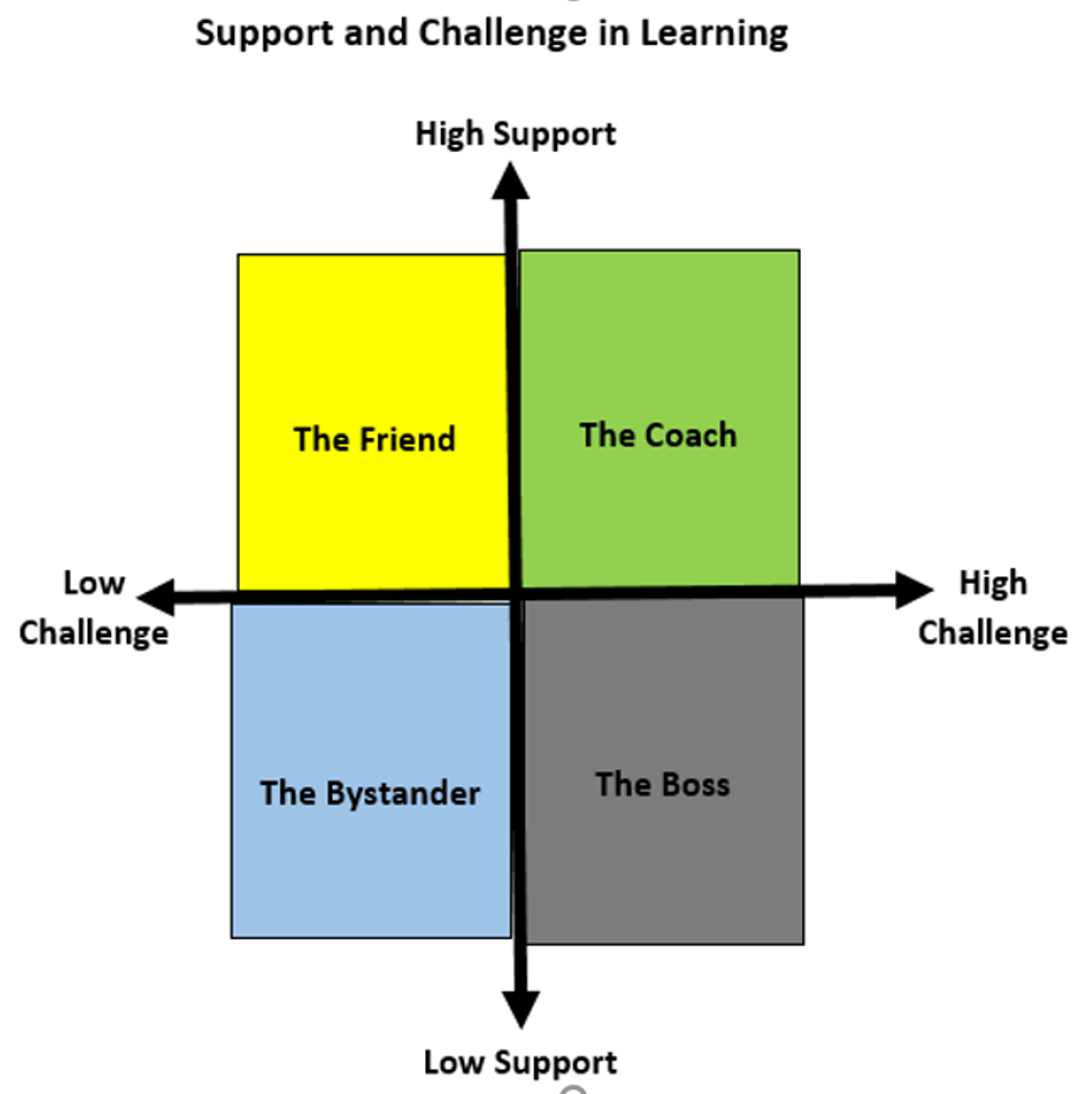 Learning for most people happens most naturally with high support and high challenge. Like a coach, high-challenge, high-support teachers look for potential and call it out. They push students to aim higher and further, to take risks, to learn from failure, to give effort. But, also like a coach, they provide tools and strategies and emotional support. Because they pour into students, they can ask much of them.