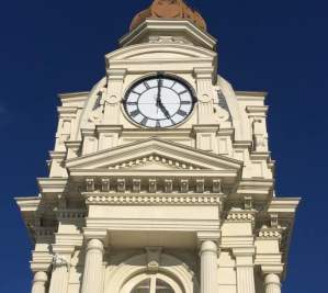 As people and Model-T’s and horses with carriages jammed Main Street in front of the courthouse, Gardiner, without ropes or nets or any other device climbed skyward over stones and moldings and pediments until he reached the top of the mansard roof. He stood there with only the clock tower and the sky above him, bowing and waving to a cheering crowd. And then he climbed up around the clock to Lady Justice who stood at the apex of the clock tower.