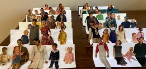 I spent hours naming these people, assembling them into families, and seating them together on church benches made from folded catalog pages. My favorite was a little girl named Karen, who wore a pink coat with a pink, lace-edged cap