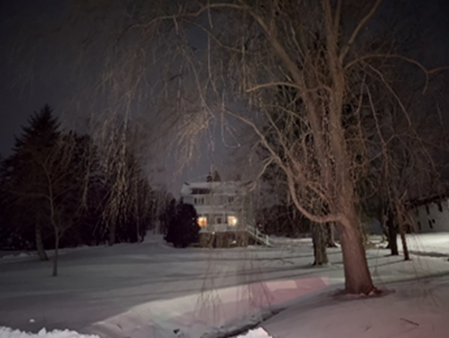 That photo my sister sent—I peer into it again. It’s ethereal, giving me the illusion I could walk up the steps and open the door and find myself sitting on a bench behind the lit window. A longing comes through me for this most innocent part of my life.